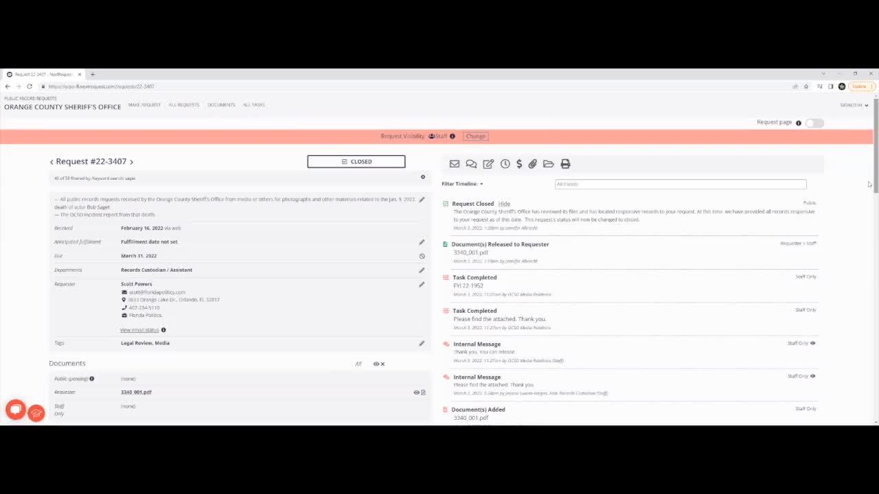 Video: Corporal Sergio Uribe shows how NextRequest and its powerful features helped OCSO during its influx of Bob Saget related records requests.