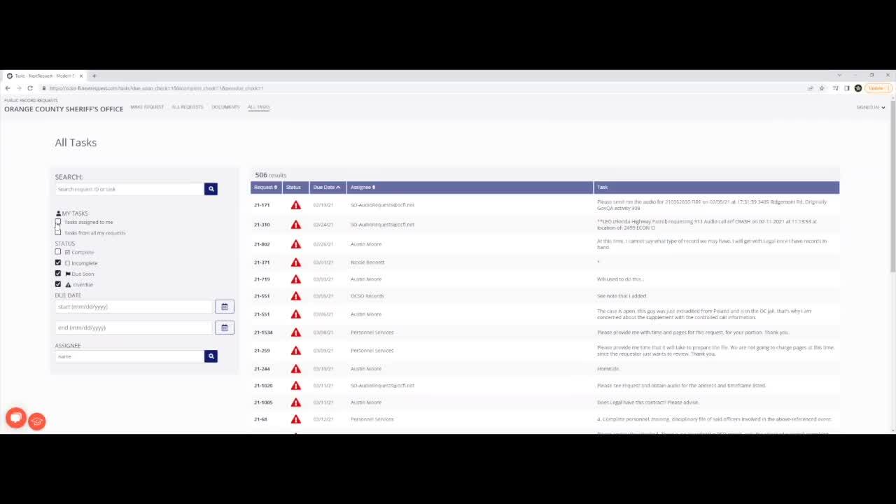 Video: Corporal Uribe demonstrates the ease of identifying the number of open tasks, who is assigned what, and what tasks need attention first to prioritize OCSO’s workflow.