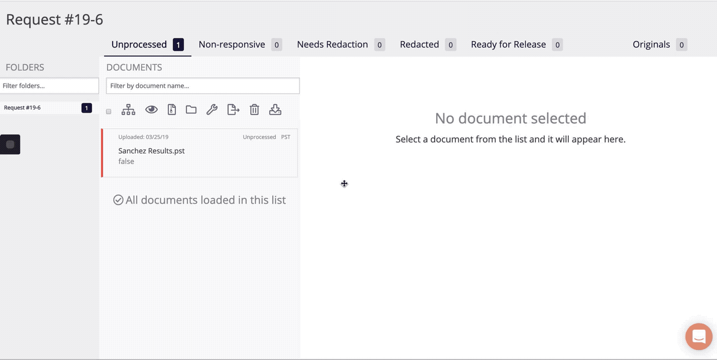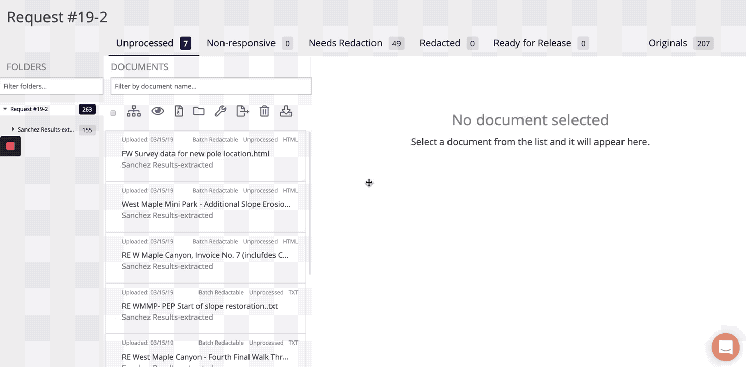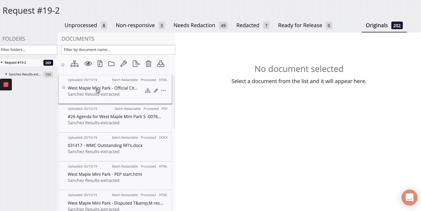 With bulk redaction, you can redact information from not one but hundreds of documents at one time, make comments, and give reasons for batches of redactions. When documents are ready, you can take bulk actions to move, delete, download, zip, finalize, or release many documents at once.