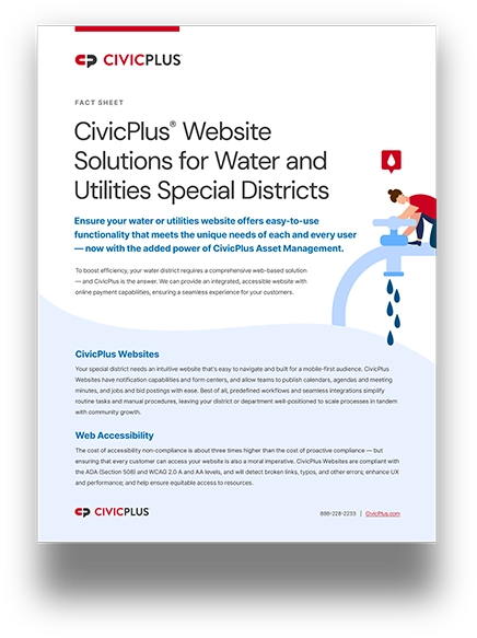 Download “CivicPlus Website Solutions for Water and Utilities Special Districts” to learn more about our comprehensive CMS software and experience the easy-to-use functionality for yourself.