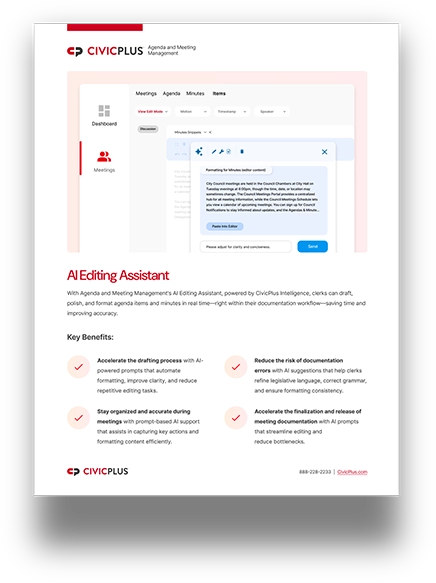 AI Editing Assistant transforms the way municipal clerks create meeting agendas and minutes. Clerks gain real-time support for grammar, clarity, formatting, and translation, without leaving their workflow.
