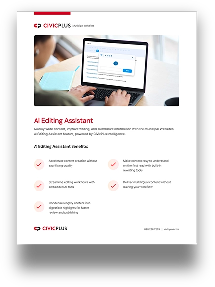 Learn how the Municipal Websites AI Editing Assistant can help you better share information, work more efficiently, and serve your community with confidence.