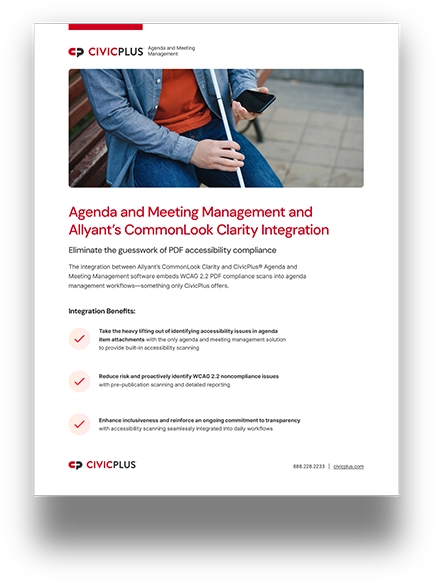 The integration between Allyant’s CommonLook Clarity and CivicPlus Agenda and Meeting Management software embeds WCAG 2.2 PDF compliance scans into agenda management workflows—something only CivicPlus offers. Download the fact sheet to learn more.