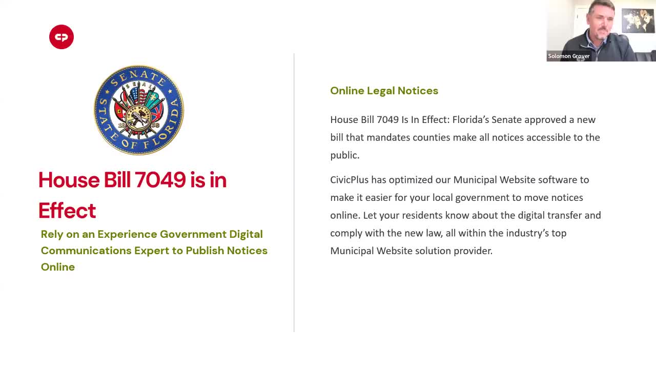 In this ten-minute video, CivicPlus® Enterprise Account Executive Solomon Grover shares how Florida counties can take steps to meet the requirements of Florida House Bill 7049 and how CivicPlus can help you:
