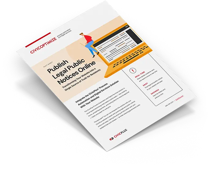 With CivicPlus, creating and managing a website that’s both user-friendly and accessible becomes a breeze. Designed for seamless searches and integration with various government tools and solutions, your team can post legal and public notices in real-time, in addition to the information commonly published on local government websites. Time sensitive notifications, relevant information and updates about ongoing initiatives and local events , are all examples of necessary pieces to outfitting your CivicPlus Municipal Website as a single source of truth and access for the community.