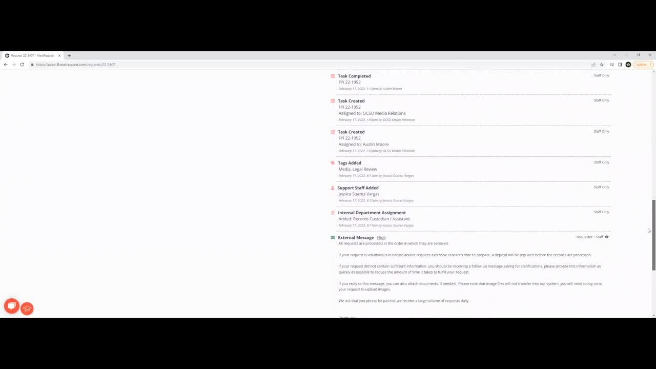“The audit trail and timeline feature is extremely helpful from when a request is opened and a task is assigned,” said Uribe. “We see those tasks, as well as who has been added, who has been removed, and what tasks were completed. And I think in that audit trail, that entire timeline, we can see from start to finish what steps we’ve taken, what has been removed or added, released, and all that is important for us internally and externally as we fulfill public records requests.”