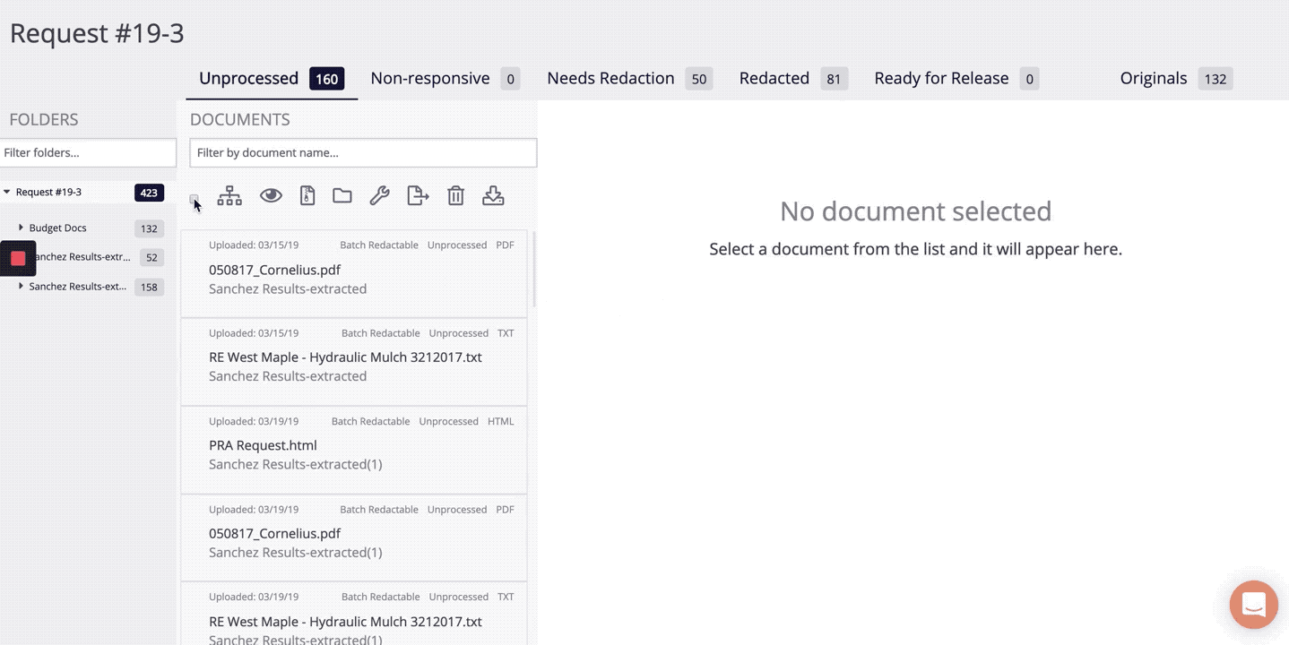 With bulk redaction, you can redact information from not one but hundreds of documents at one time, make comments, and give reasons for batches of redactions. When documents are ready, you can take bulk actions to move, delete, download, zip, finalize, or release many documents at once.