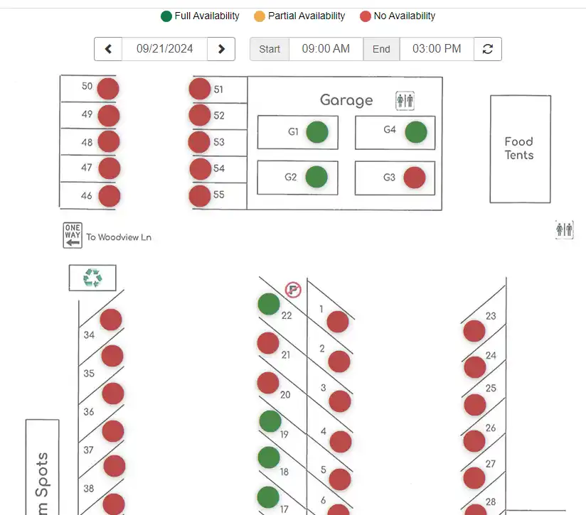 Above: Maine Township’s interactive garage sale map showing real-time availability of vendor spaces (green = available, red = sold).
