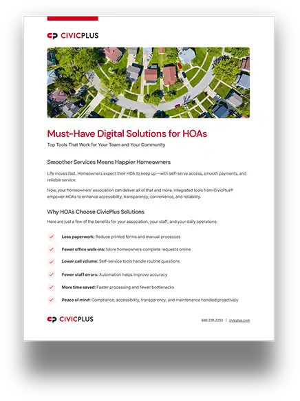 CivicPlus® gives your association purpose-built solutions to manage homeowner needs in one place, so operations run smoother, dues get paid, updates get seen, and requests are handled quickly.