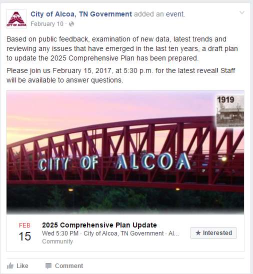 When implemented as part of a strategic communication plan, social media can be an effective way to promote attendance at community events. For example, the City of Alcoa, Tennessee, uses Facebook events to invite residents to attend community meetings. When people interact with such posts, an update appears on their timeline, helping further to spread the message to even more interested followers.