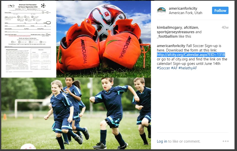 Social media is a great way to reach busy moms and dads. American Fork City, UT, uses Instagram to encourage residents to sign up for their fall youth soccer league. Using engaging photos and a direct link to their activity registration page, they have made registrations quick and easy for busy parents.