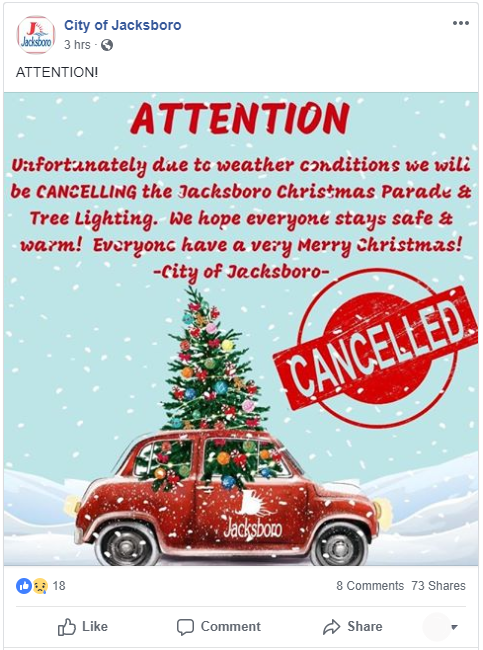 How do you communicate to your community of thousands or millions that your administration has unexpectedly had to cancel a long-planned event? Residents may not watch the local five o’clock news or check their email in time to receive the news of a cancellation. They are, however, likely to catch an update if it appears on social media. The average American checks Facebook eight times per day, which means the news of your cancelled event has the best chance of reaching them in time if it appears in their news feed. When the City of Jacksboro had to cancel its Christmas Parade and Tree Lighting, it utilized Facebook to spread the word.