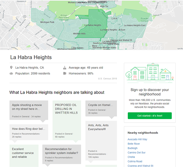 Nextdoor positions itself as “the private social network for your neighborhood” and offers benefits to both municipalities and their residents. For local governments, it allows public agencies to create profiles to connect with local neighborhoods, take part in two-way dialogue, and maintain visibility into the issues that matter most to residents. For residents, it allows neighbors to connect, share information, find local community resources such as babysitters, and alert one another to events of concern, such as a streak of nearby break-ins. One way that La Habra Heights, CA, leverages Nextdoor is to foster dialogue among neighbors and identify trending topics of interest. Read more about the benefits of Nextdoor as part of your local government communication plan here.