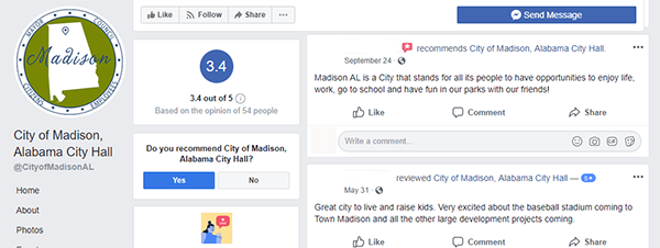 Facebook business pages offer a Recommendations and Reviews tool that allows customers to provide direct, public feedback and rate their experiences with the organization. This functionality is just as relevant for public sector entities as it is for the private sector. By allowing residents to rate and recommend your community, you generate valuable feedback for prospective residents who value crowd-sourced opinions and insights. In the City of Madison, Alabama, for example, resident feedback and recommendations are solicited and shared on its Facebook page.
