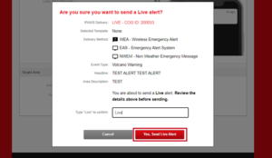 In addition, the sender of a live IPAWS alert must type “Live” into the system and press a button that states “Yes, Send Live Alert.”